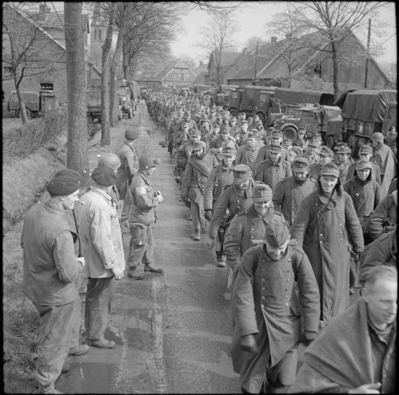 Ende eines Alptraums: Tausende deutsche Soldaten marschieren in Gefangenschaft – Deutschland, 1945.H