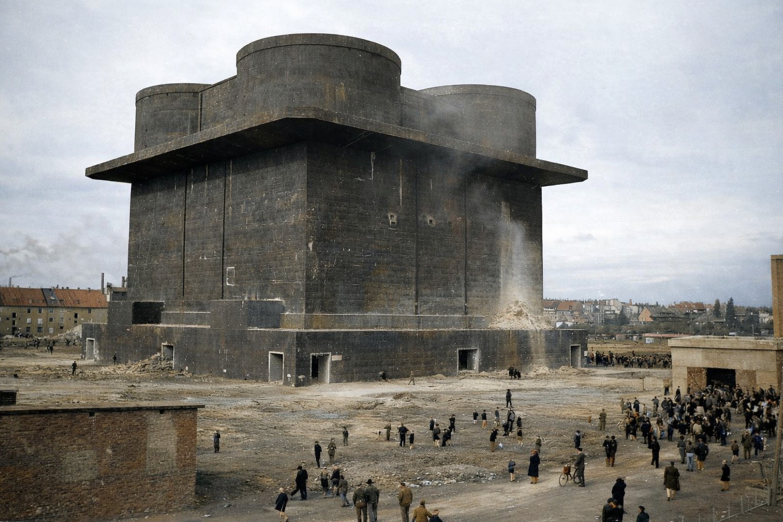 Deutschland nach dem Krieg: Gigantischer Flakturm ragt über den Trümmern – ein stiller Zeuge der zerstörten Städte.H